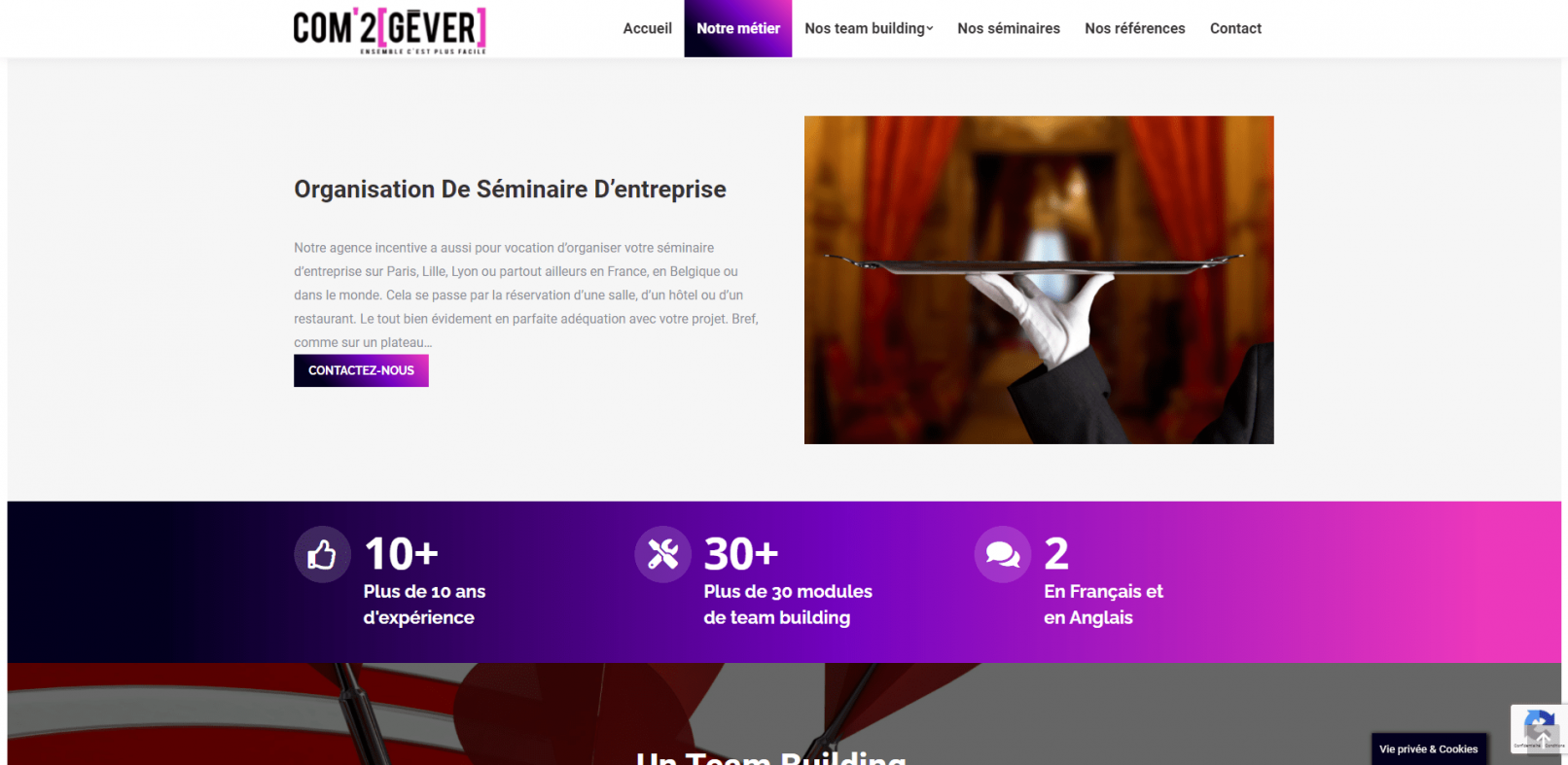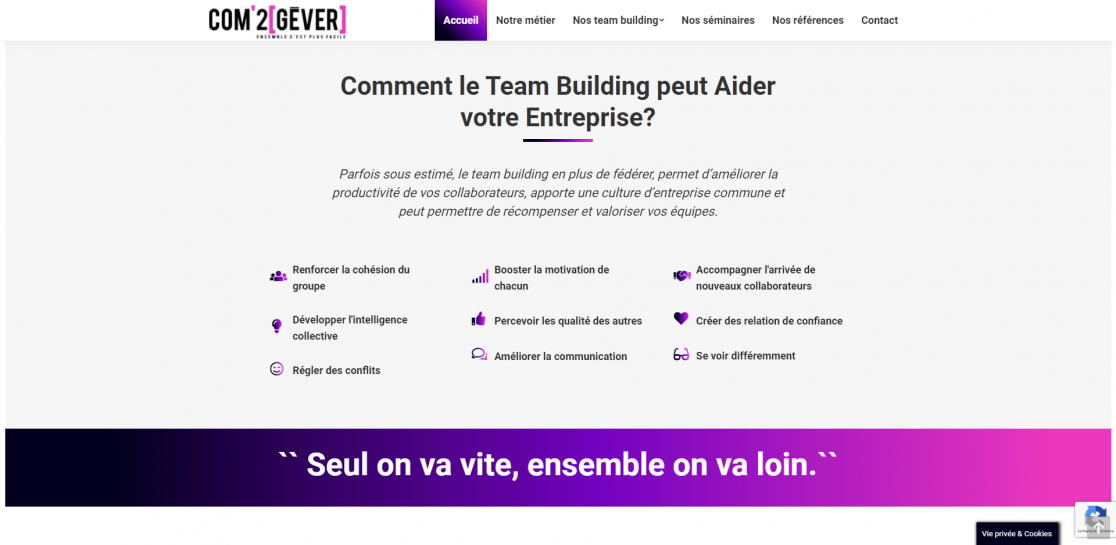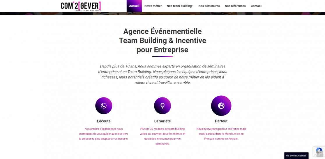 COM2GEVER est une agence événementielle spécialisée dans l’organisation de séminaire et l’organisation de team building. Nous maîtrisons plus de 30 modules de team building personnalisables qui touchent tous les thèmes. Nous intervenons partout dans le monde en Français comme en Anglais..