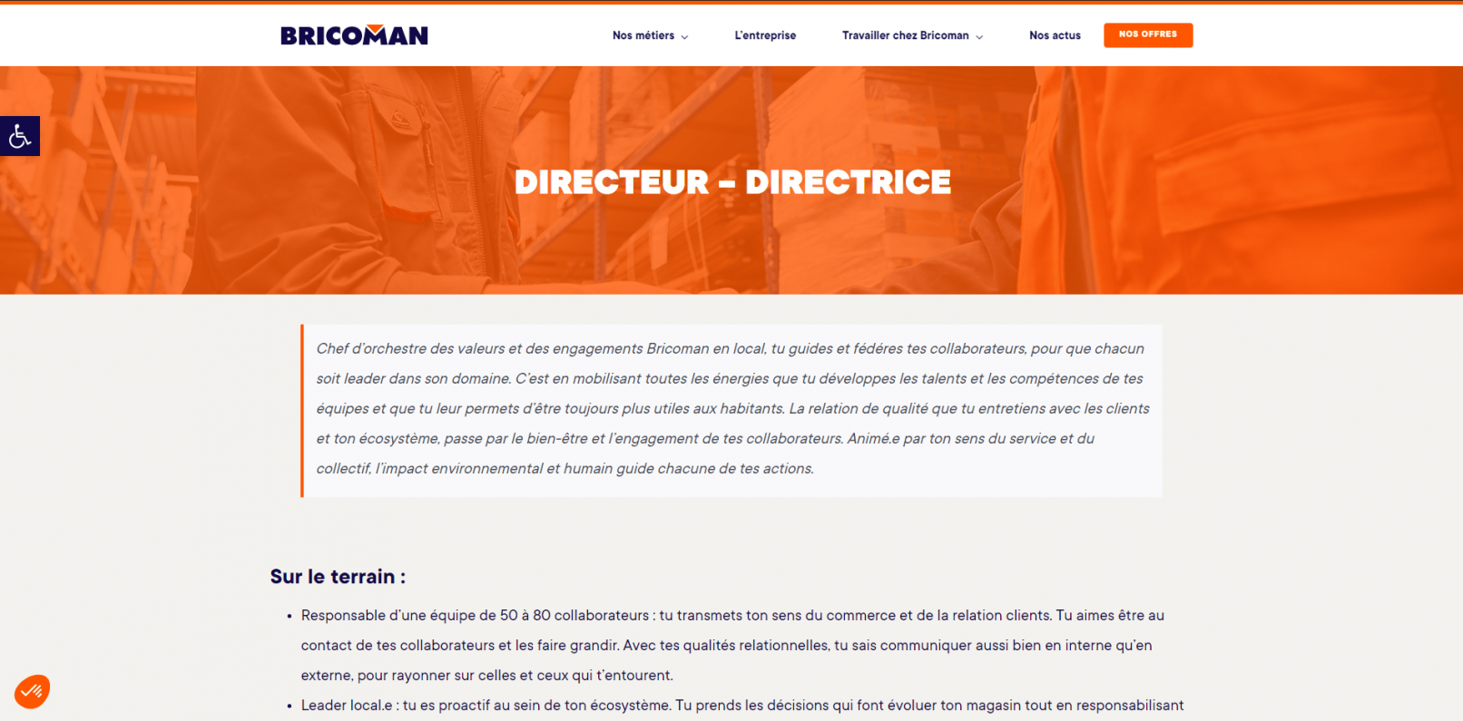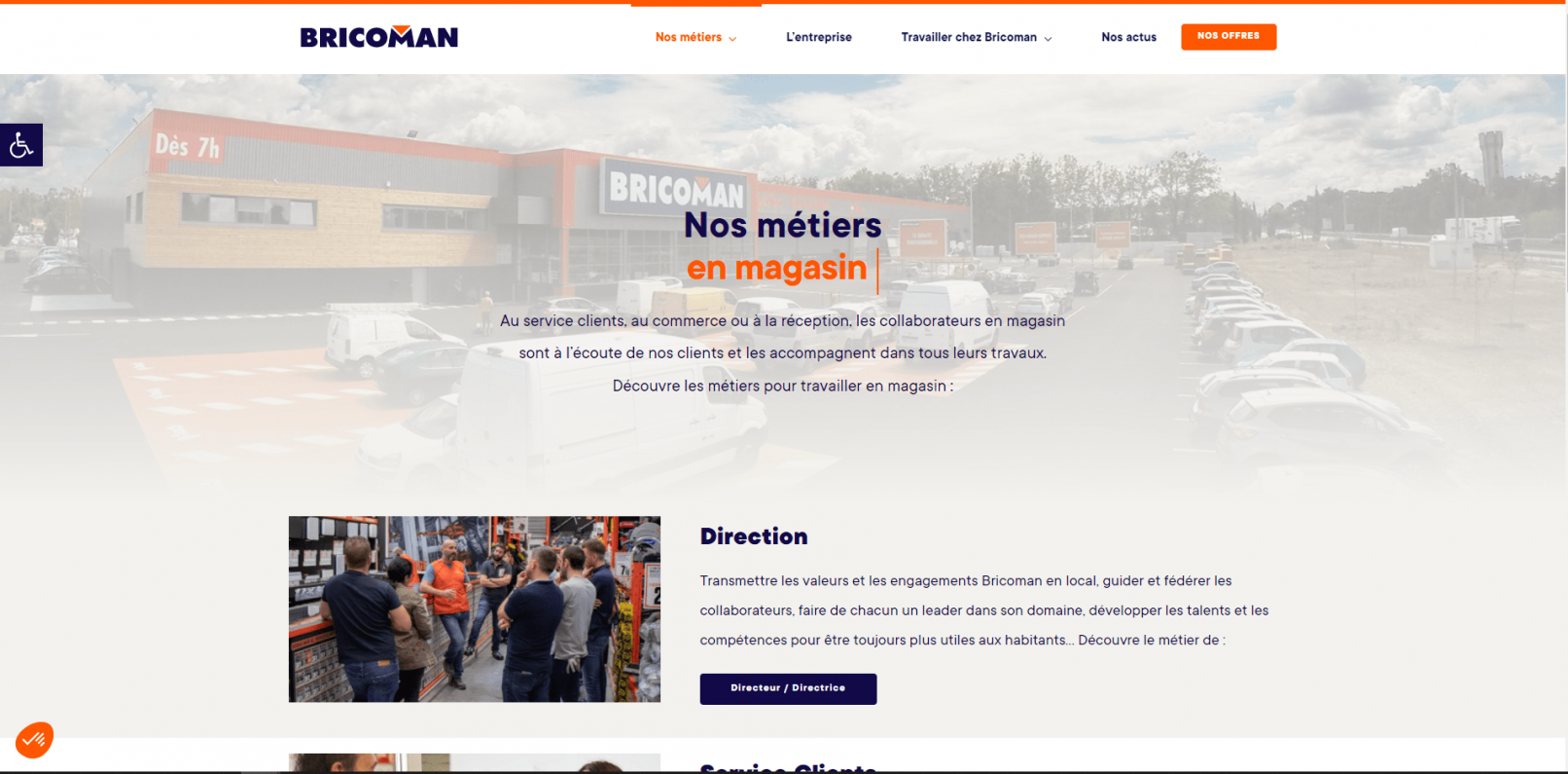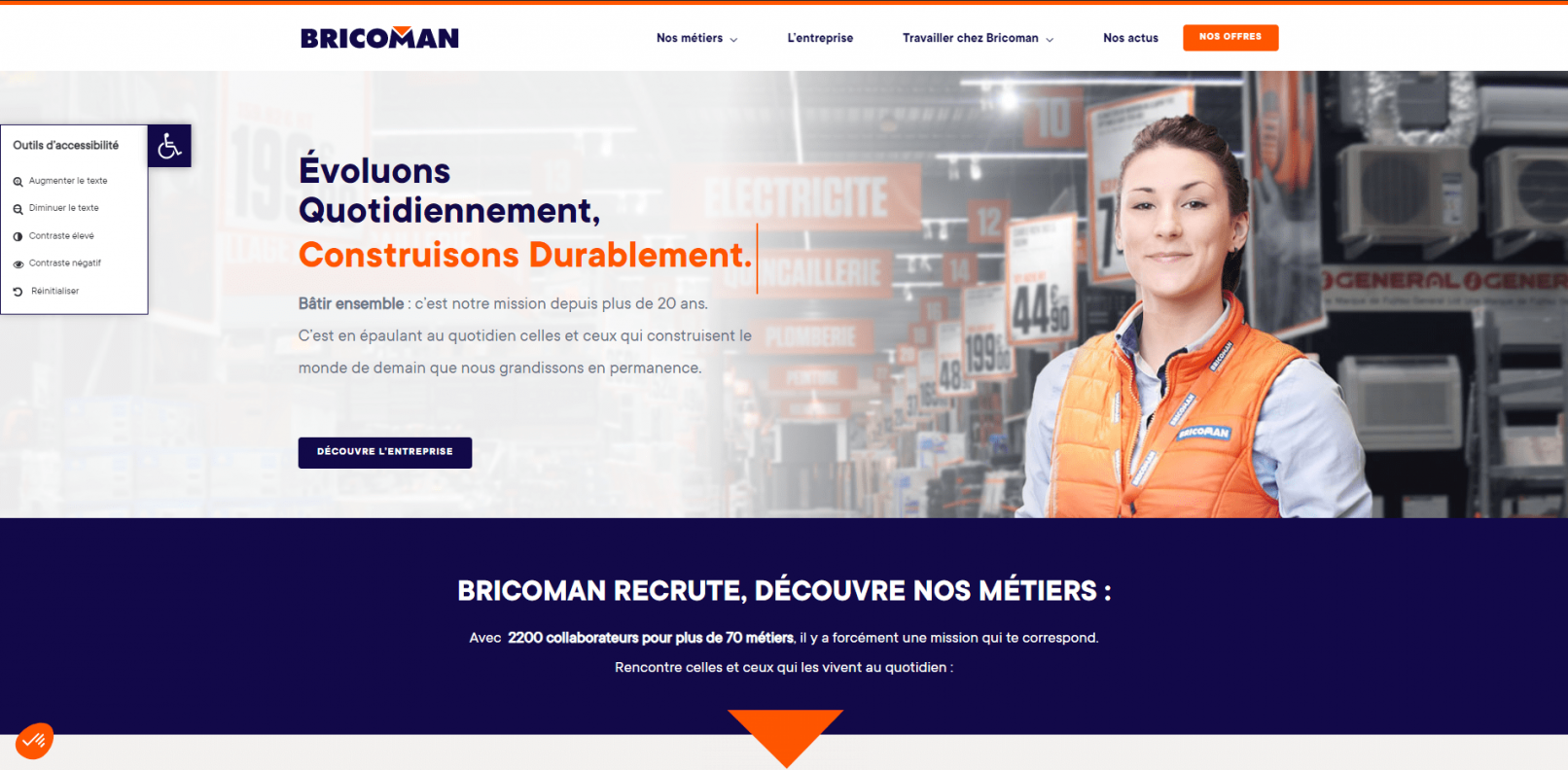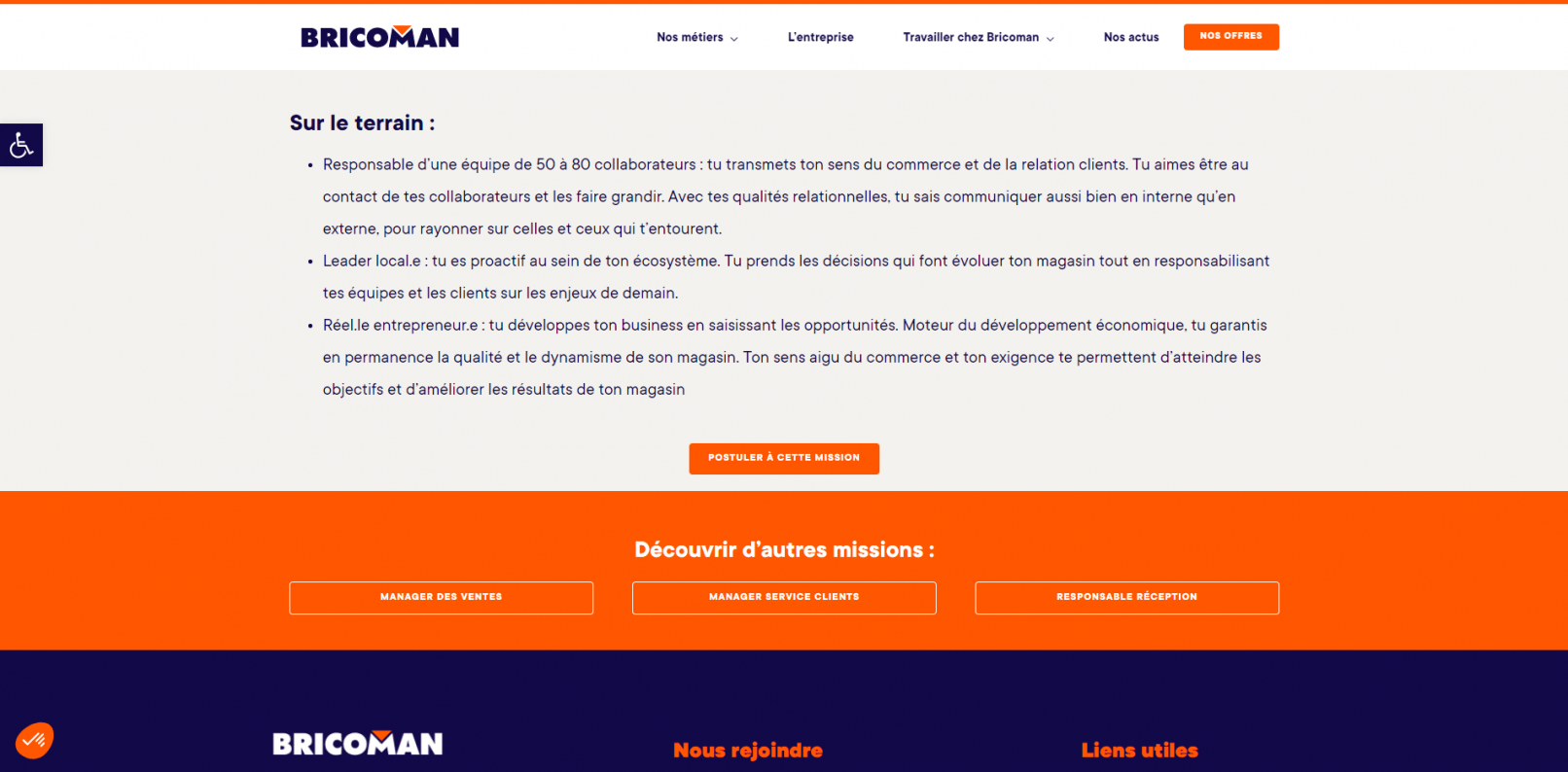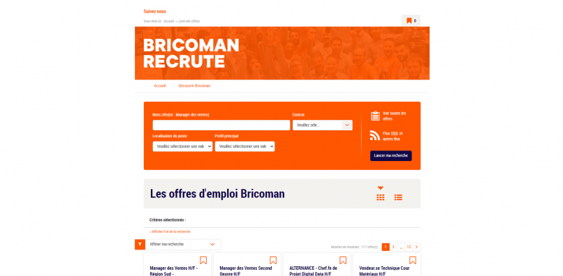 Le site internet recrute.bricoman.fr possède un design responsive très fluide. Une ergonomie accrue par la simplicité du design, la mise en cache poussée du site internet (plus on visite les pages du site internet, plus le chargement des pages sera rapide), la mise à disposition d’un outil d’accessibilité pour les personnes qui en ont besoin. L’interface de recrutement (l’ATS) est totalement refondue c’est maintenance plus accessible de déposer une candidature. Webagencelille.com a pris soin d’optimiser chaque design afin qu’il soit le plus pertinent pour la navigation du visiteur en fonction de son support.