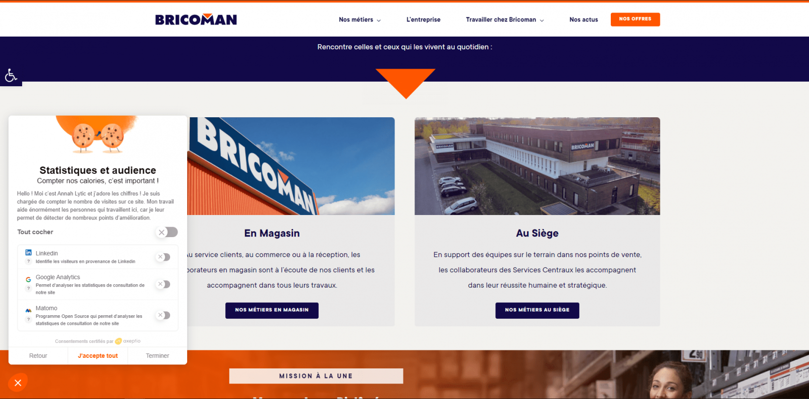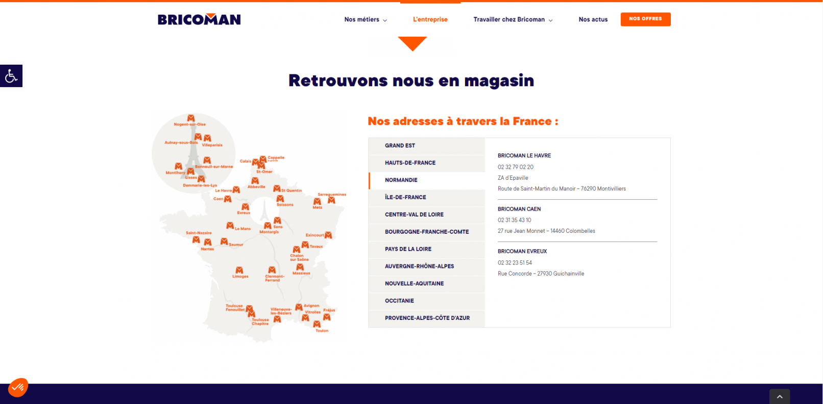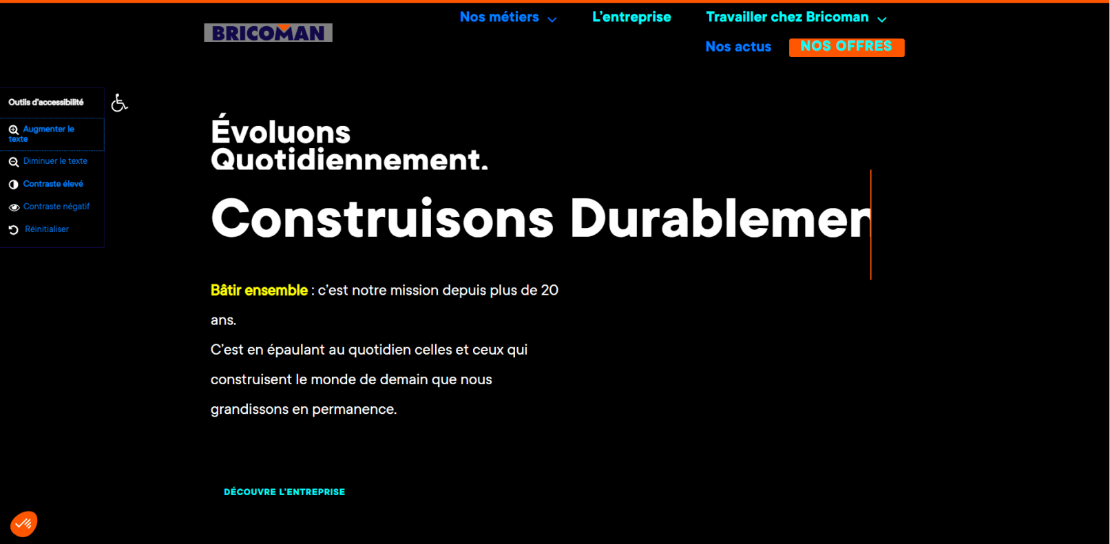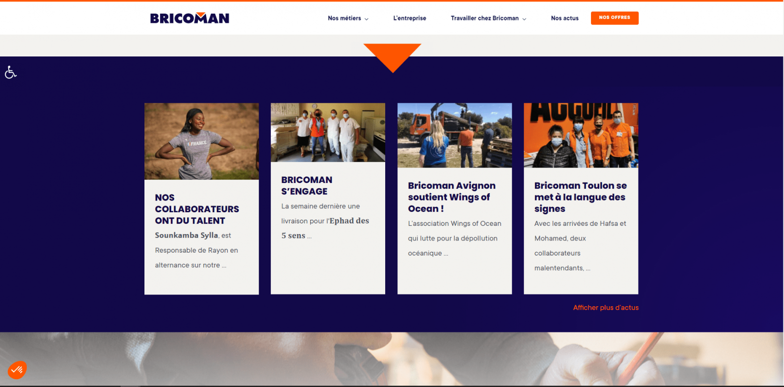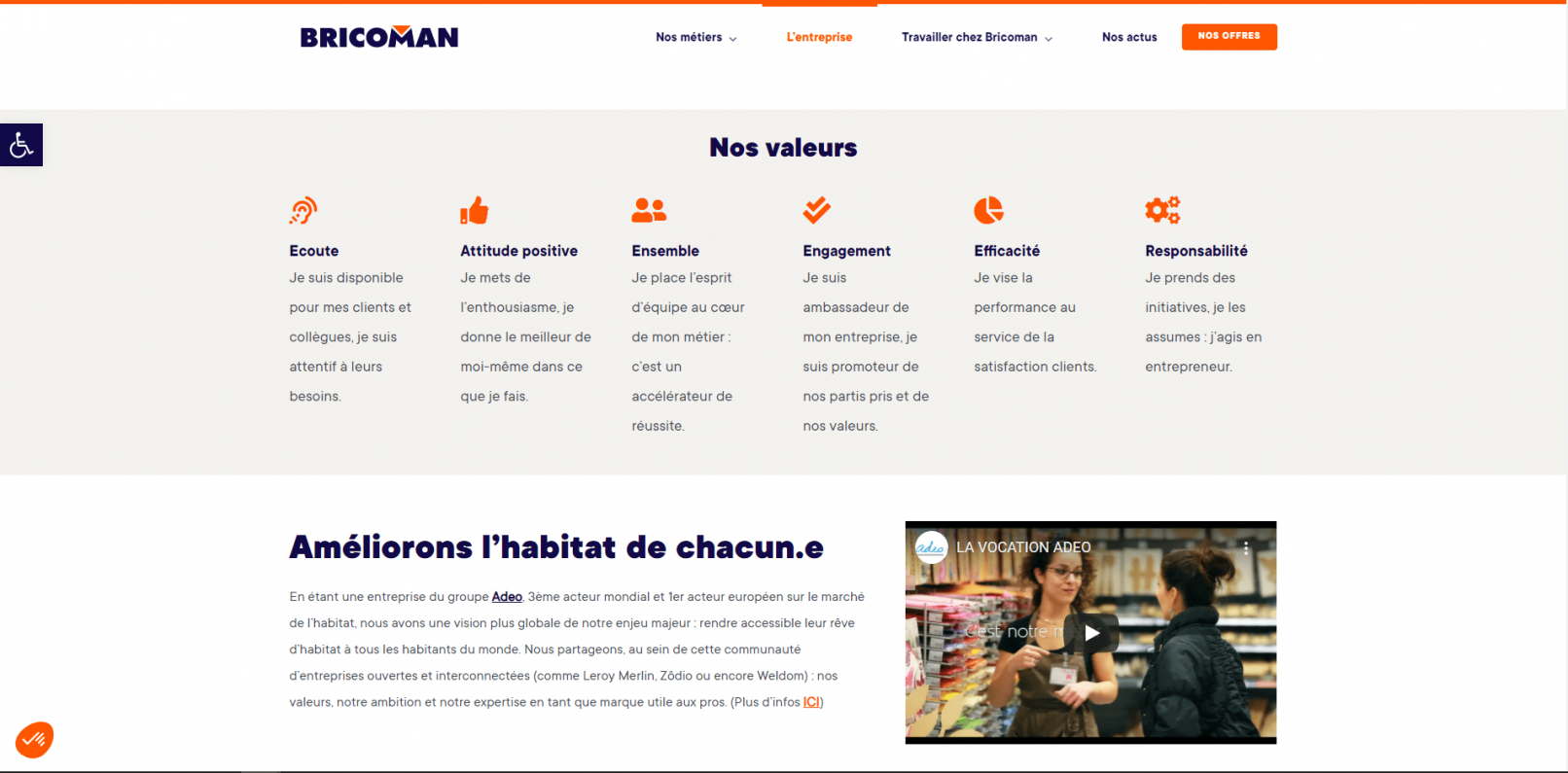 Le site internet recrute.bricoman.fr possède un design responsive très fluide. Une ergonomie accrue par la simplicité du design, la mise en cache poussée du site internet (plus on visite les pages du site internet, plus le chargement des pages sera rapide), la mise à disposition d’un outil d’accessibilité pour les personnes qui en ont besoin. L’interface de recrutement (l’ATS) est totalement refondue c’est maintenance plus accessible de déposer une candidature. Webagencelille.com a pris soin d’optimiser chaque design afin qu’il soit le plus pertinent pour la navigation du visiteur en fonction de son support.